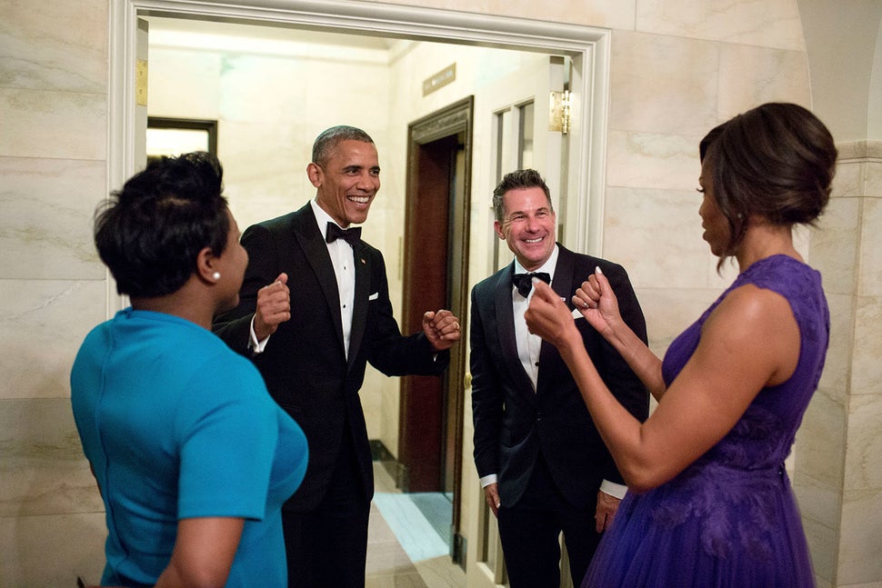 President Barack Obama and first lady Michelle Obama celebrate with outgoing social secretary Jeremy Bernard and incoming social secretary Deesha Dyer in the Ground Floor Corridor following the State Dinner at the White House on April 28, 2015.